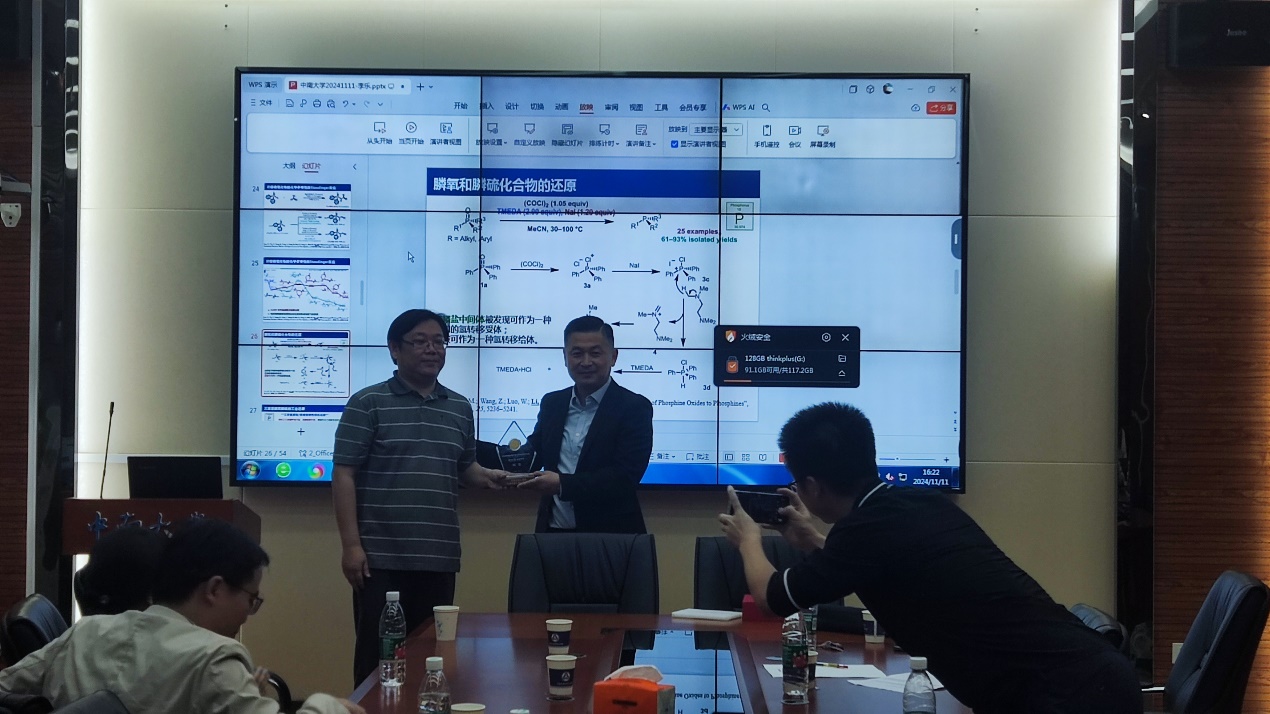 讲座接近尾声,公司老师向李乐教授请教在合成共聚物时机理如果和医学知识相关,能不能避开已发表的专利,李老师回答是可以避开的,找到新的适合课题组自主研发的新路径;也有同学问到关于三苯基磷氧磷硫的还原机理是否有实验支持,李乐教授给出了肯定的答复,同时也详细介绍了实验所用的思想。为感谢李乐教授,阳华教授为李老师送上了学院的名师讲堂纪念奖杯。