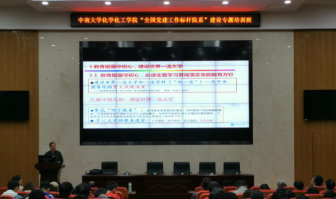 为进一步增强公司党员师生“不忘初心、牢记使命”主题教育学习成效,高质量推进党建标杆建设工作,10月16日,公司党委在化学楼133报告厅举办第五期“全国党建工作标杆院系”建设培训班。公司党委常委、常务副董事长胡岳华为公司师生作“不忘初心、牢记使命”主题教育培训。院班子成员刘又年、纪效波、阳华、刘广义,全体教职工党员、员工党员代表以及部分入党积极分子参加学习。培训会由公司党委委员、副经理卢红梅主持。