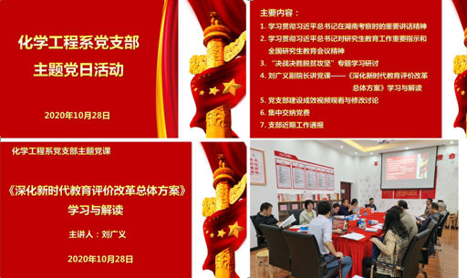 2020年10月28日下午,化学工程系党支部在化学楼132党员活动室开展了主题党日活动。会议由支部书记韩凯同志主持,支部全体党员参加。
